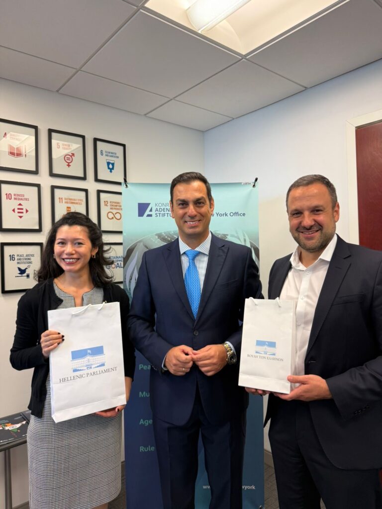 Ειδικότερα πραγματοποιήσαμε  επαφές στο Ιδρυμα KAS γραφείο Νέας Υόρκης με τον Thomas Tödtling, Εκτελεστικό Διευθυντή και  Teresa Val, Διευθύντρια Προγράμματος,  με τον Felipe Paullier, Βοηθό Γενικό Γραμματέα για Υποθέσεις Νεολαίας, Γραφείο Νεολαίας των Ηνωμένων Εθνών, με θέμα Προώθηση της Συμμετοχής των Νέων για Πιο Αποτελεσματική και Συμπεριληπτική Παγκόσμια Διακυβέρνηση, τον Adam Lupel, Σύμβουλο, με θέμα «Ο ρόλος των Μικρών και Μεσαίων Κρατών στο Πολυμερές Σύστημα».